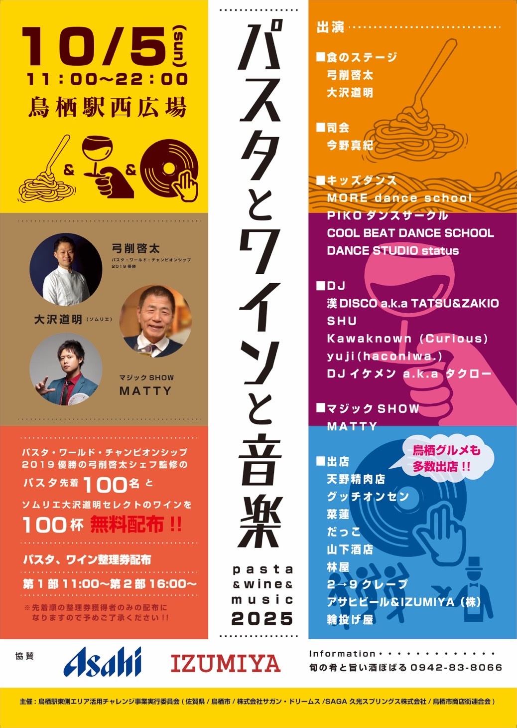 - 5日(日曜日)パスタ世界一の味が楽しめる"「パスタとワインと音楽」"(参考:パスタとワインと音楽2025 [その他のファイル/388KB]チラシ)